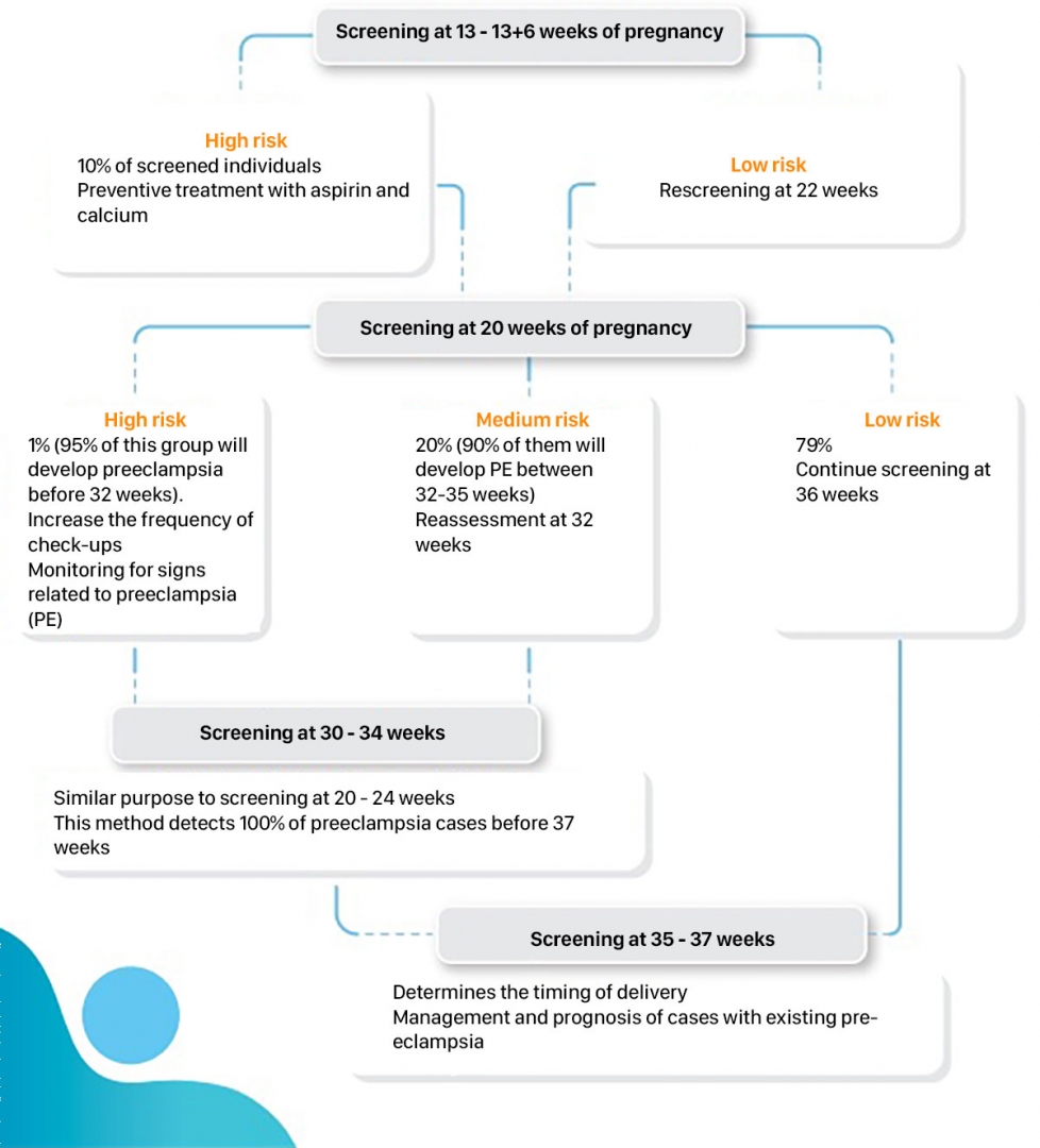 | - Pregnant with a baby - Multiple pregnancy - History of pregnancy preeclampsia - Systemic lupus erythematosus - Hereditary hemophilia | - Chronic hypertension- Hereditary hemophilia - Body mass index (BMI) before pregnancy from over 35 kg/m2 - Antiphospholipid syndrome - Diabetes and gestational diabetes | - Pregnant mother from over 35 years old - Kidney disease - Use assisted reproduction methods - There is an obstructive sleep apnea |