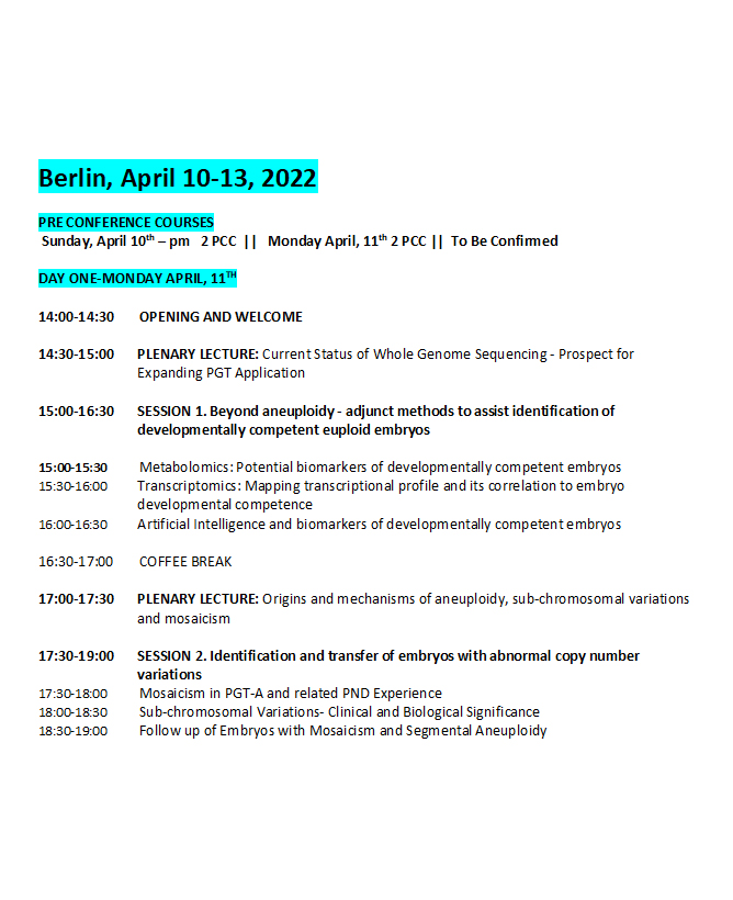 Trong hội nghị lần thứ 19 của Hiệp hội Quốc tế Chẩn đoán Di truyền Tiền làm tổ được tổ chức tại Berlin (Đức) năm nay, có tất cả 8 chủ đề chính lần lượt được báo cáo trong thời gian từ ngày 11-13/4. Chủ đề năm nay được trình bày xoay quanh những tiến bộ trong công nghệ xét nghiệm PGT và sự phát triển của phôi: