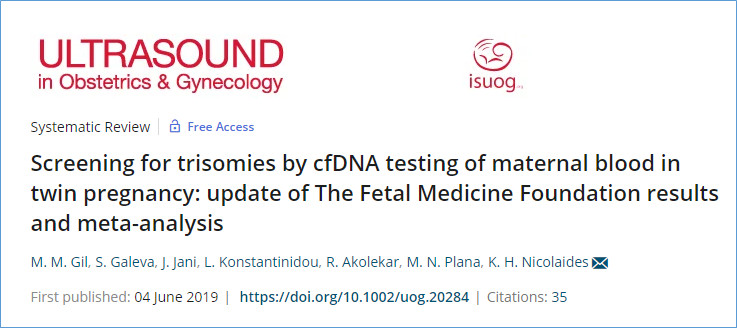 - Gil, M. M., et al. "Screening for trisomies by cfDNA testing of maternal blood in twin pregnancy: update of The Fetal Medicine Foundation results and meta‐analysis." Ultrasound in Obstetrics & Gynecology53.6 (2019): 734-742.
