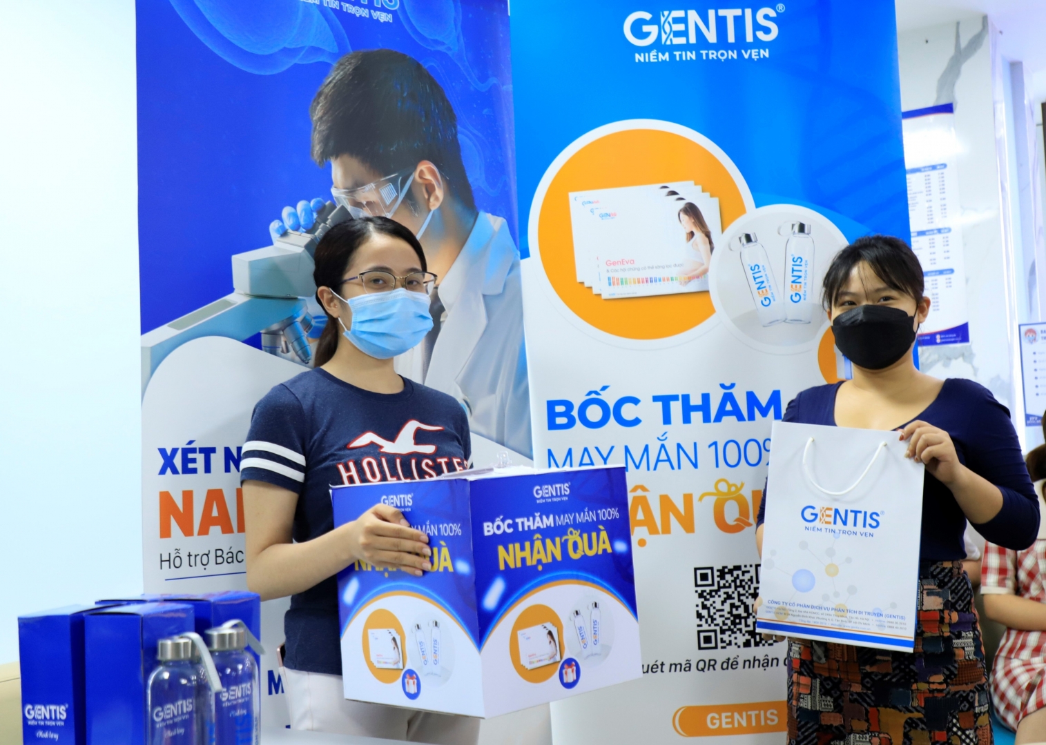 Bên cạnh đó, những Quý khách hàng đến trực tiếp Bệnh viện Đông Đô sẽ được nghe tư vấn về các dịch vụ xét nghiệm tại bàn tư vấn và được tham gia chương trình Bốc thăm trúng thưởng từ GENTIS với những phần quà hấp dẫn như bình nước GENTIS, cẩm nang sàng lọc dị tật trước sinh GenEVA…