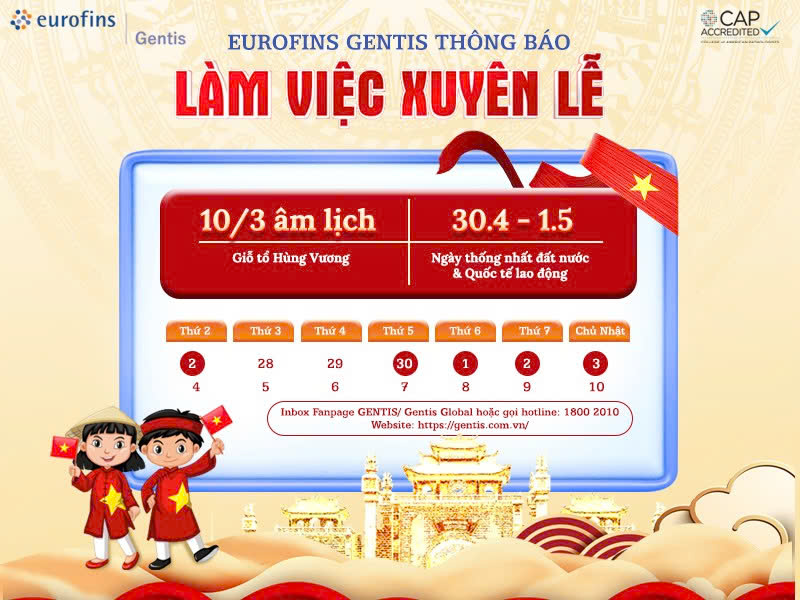 Giỗ Tổ Hùng Vương (mùng 10 tháng 3 âm lịch) cùng kỳ nghỉ lễ 30/4 - 1/5 là những dấu mốc quan trọng, mang ý nghĩa đặc biệt đối với dân tộc Việt Nam. Trong không khí trang nghiêm và thiêng liêng ấy, nhiều cơ quan, tổ chức và doanh nghiệp sẽ tạm ngưng hoạt động để nghỉ lễ. Tuy nhiên, với mong muốn đảm bảo sự liên tục trong công việc cũng như mang đến trải nghiệm dịch vụ tốt nhất cho khách hàng, Eurofins GENTIS xin trân trọng thông báo về kế hoạch làm việc trong dịp lễ như sau: