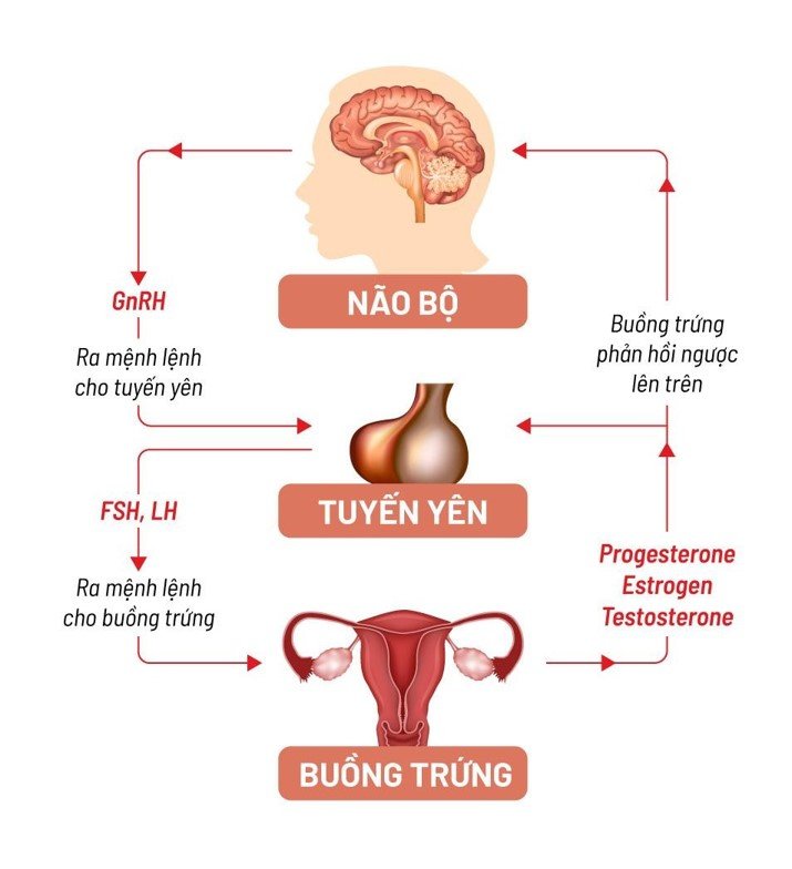 - FSH kích thích sự phát triển của noãn bào chưa trưởng thành. Khi bắt đầu phát triển, noãn bào giải phóng estradiol, từ đó gây tác động ngược lên vùng dưới đồi và tuyến yên để tăng cường giải phóng GnRH và LH, thúc đẩy sự rụng trứng.