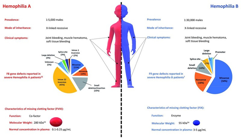 | The F8 genes are large, occupying about 0.1% of the X chromosome, consisting of 26 exons 186,000bp in size and encoding 2332 amino acids. The gene that regulates FVIII synthesis is located at position Xq28 on the X chromosome. - Common mutations (F8): Inversion of Intron 22 (usually inversion, also known as IVS-22). Intron 1 inversion (usually inversion, also known as IVS-1). Other variants include point mutations (including nonsense mutations) and small fragment deletions. Gene disruption variants. Point mutations cause amino acid changes. + Combined factor VIII and V deficiency (LMAN1 and MCFD2 genes). | Gene F9 - located at the end of the long arm of the X chromosome, contains 8 exons and 7 introns. F9 is the largest gene in the family of vitamin K-dependent clotting factors; it contains highly conserved features (exon number, splice types) that are highly conserved in homologous vitamin K-dependent proteins. - F9 Cambridge and F9 Oxford - Defects in post-translational processing that prevent cleavage of the 18-amino-acid propeptide of factor IX. - F9 Chapel Hill - Impaired activation of zymogen due to interference with one of the factor IX cleavage sites - F9 Vancouver - Interference with the catalytic activity of factor IX with factor X by a point mutation that changes isoleucine to threonine at amino acid position 397, affecting the hydrogen bonding between threonine 397 and the oxygen carbonyl of tryptophan 385 - Hemophilia Bm - A dysfunctional protein that causes prolongation of prothrombin time (PT). Complete gene deletion has been described but is rare. |