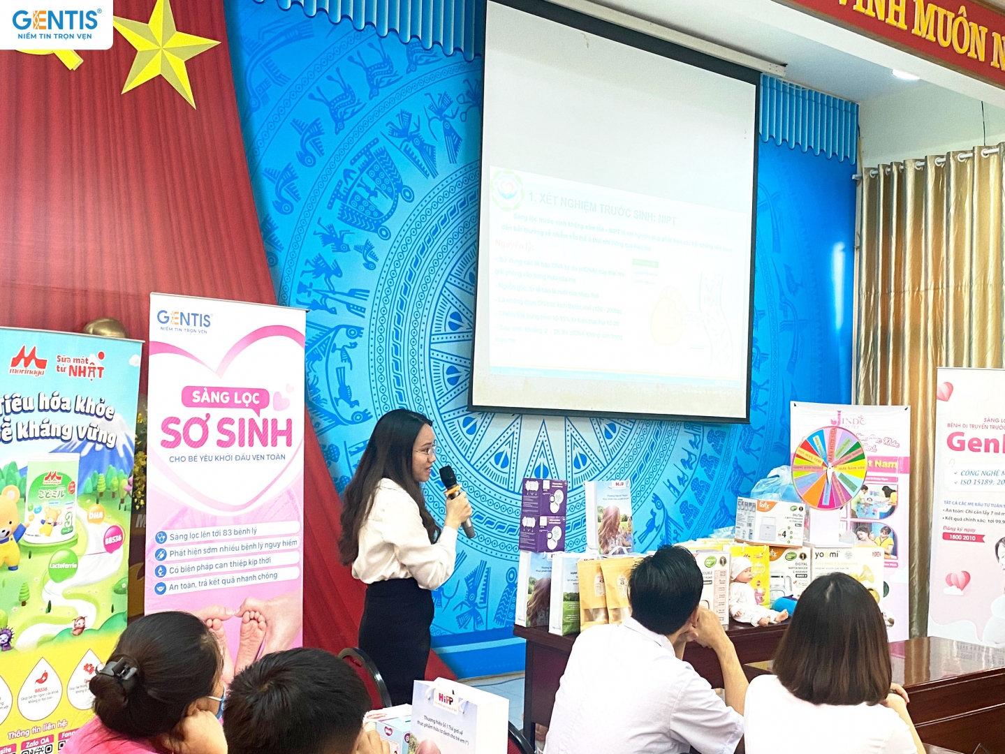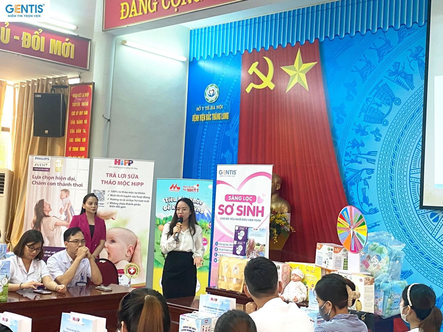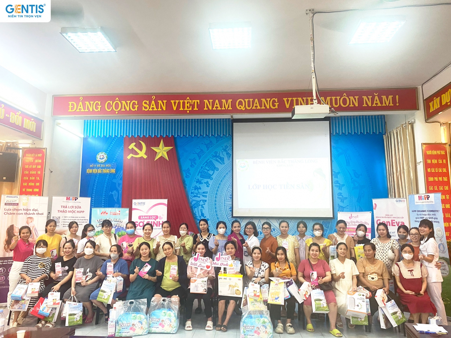 The prenatal class had the participation of Specialist Level 1 Dr. Hoang Dang Thong - Deputy Head of the Obstetrics Department; Ms. Bui Thi Diem - Head Midwife; Pharmacist Duong Thi Phuong - Head of Product Management (PM), representative of GENTIS company and more than 50 parents are consulting in the obstetrics department at the hospital.