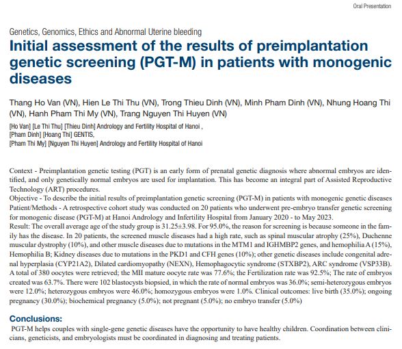 As a globally recognized organization, the scientific reports presented directly at the conference undergo a rigorous selection process. At the 2023 conference, Vietnam was honored to be the sole representative with a directly presented report from the research team of GENTIS and Hanoi Hospital of Andrology and Infertility on Preimplantation Genetic Testing for Monogenic Disorders (PGT-M).