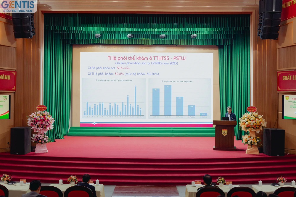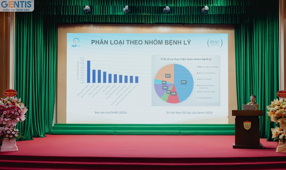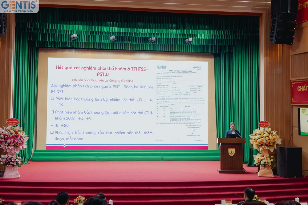 The next presented topic, "Mosaic Embryo Transfer: International Recommendations and Clinical Practice in Vietnam," shared by Assoc. Prof. Dr. Ho Sy Hung (Deputy Director of the National Assisted Reproductive Technology Center, Obstetrics and Gynecology Hospital), garnered significant interest from assisted reproduction doctors. In this report, GENTIS was honored to provide survey data from the National Assisted Reproductive Technology Center in 2023, with 513 embryos examined, revealing a mosaic embryo rate of 30.6%. The associate professor also highlighted points to consider when interpreting embryo test results in cases of mosaicism, and the order of priority for transferring mosaic embryos according to international standards and clinical practice in Vietnam.