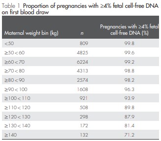 In the 2013 study by Wang et al., the team found a correlation between maternal body mass index (BMI) and total cfDNA. In thin pregnant women, total cfDNA concentrations were shown to decrease due to the dilution effect of increased plasma volume. In contrast, in obese pregnant women, total cfDNA levels were increased due to increased adipose tissue necrosis and increased vascular stromal cell death, which offset the dilution effect. Although fetal cfDNA was not affected, increased maternal total cfDNA resulted in lower FF overall (Table 1).