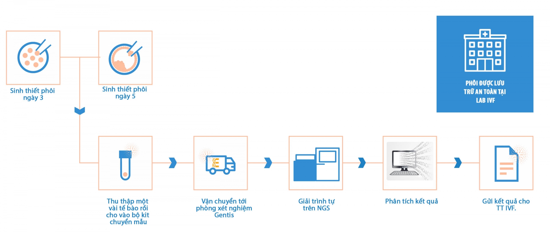 + PGT-A (Preimplantation Genetic Screening for Aneuploidy): Pre-implantation genetic testing helps to detect abnormalities in the chromosome number of embryos before transferring into the mother's uterus.