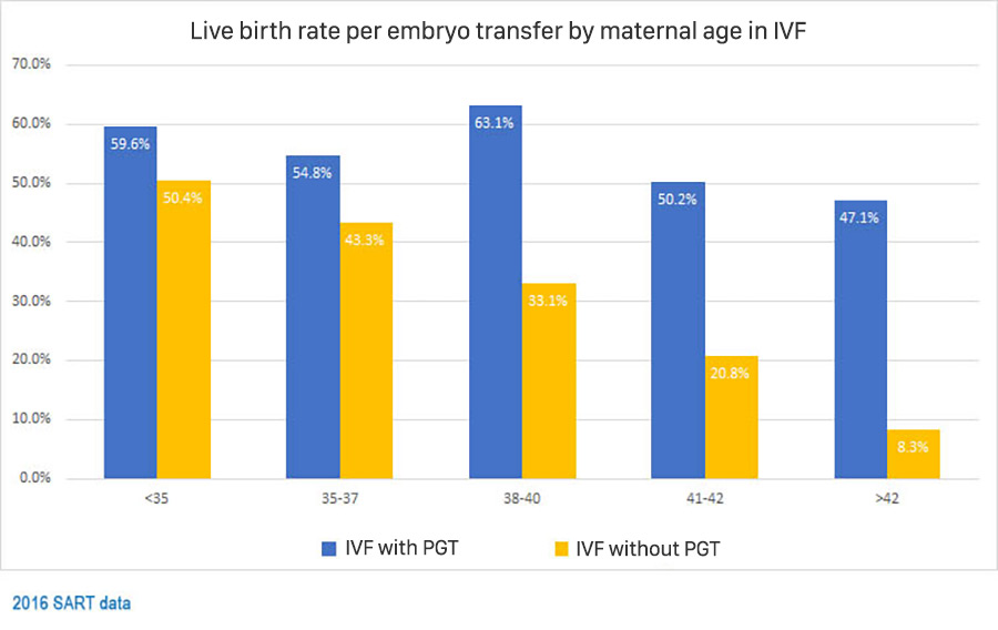 The selection of PGTest could screen for the optimal (in genetic) embryos. Thus, improve the implantation rate of IVF/ICSI cycles. In addition, PGTest helps significantly decrease the chance of having a child with an inherited genetic disorder or aneuploidy.