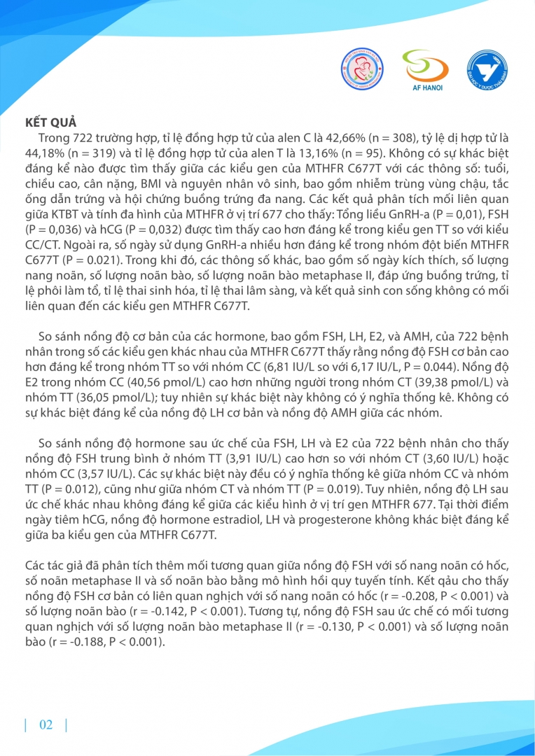 1 Sự đa hình của gen MTHFR C677T có liên quan đến FSH và sự đáp ứng với kích thích buồng trứng có kiểm soát: một nghiên cứu hồi cứu từ cơ sở dữ liệu lâm sàng.