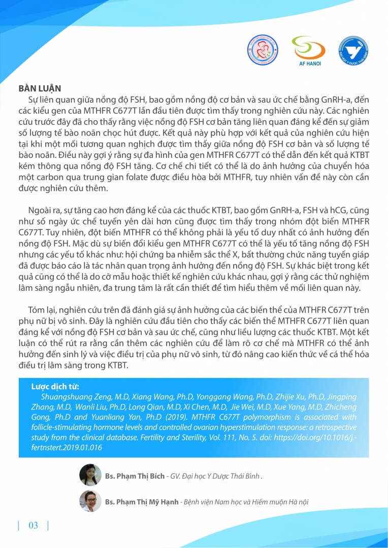 Nghiên cứu đánh giá sự ảnh hưởng của các biến thể MTHFR trên phụ nữ bị vô sinh. Đây là nghiên cứu đầu tiên cho thấy các biến thể MTHFR C677T liên quan đáng kể với nồng độ FSH cơ bản và sau ức chế, cũng như liều lượng các thuốc KTBT.