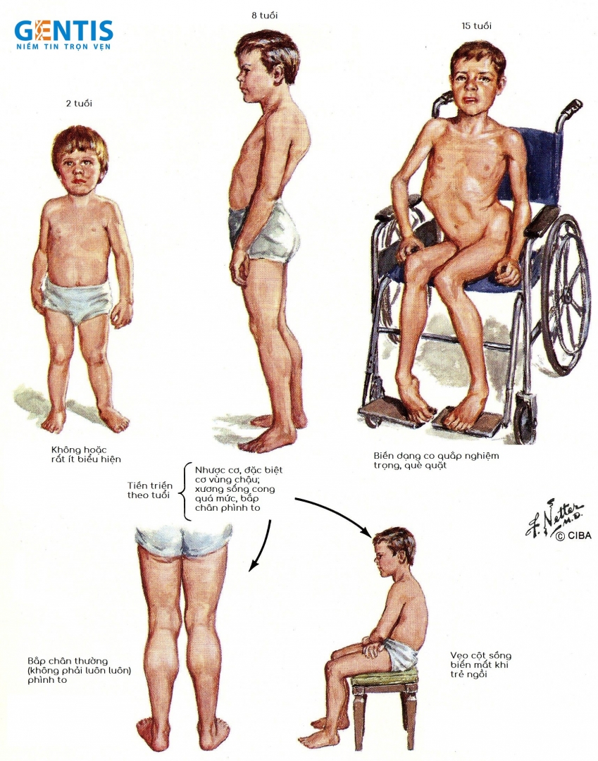 Sau đó một vài năm, trẻ có dáng đi lạch bạch hoặc đi chủ yếu bằng ngón chân. Theo thời gian, khả năng vận động giảm dần, mất khả năng tự đi lại trước tuổi 12 và thường chết ở lứa tuổi 20 vì bị tổn thương cơ tim và rối loạn hô hấp.