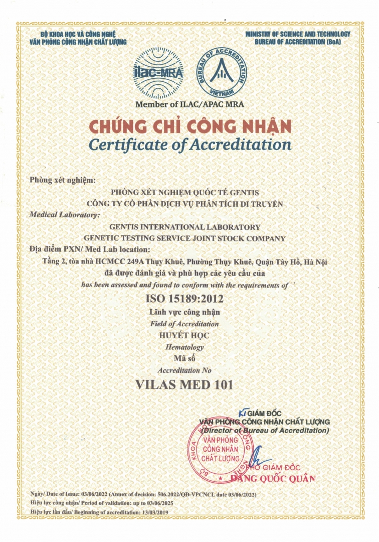 Chứng nhận phòng xét nghiệm đạt tiêu chuẩn ISO 15189:2012 của GENTIS