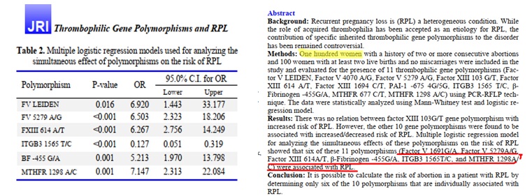 Nghiên cứu thực hiện trên 100 người phụ nữ có tiền sử sảy thai liên tiếp cho thấy có mối liên quan chặt chẽ với các đa hình di truyền Factor V 1691G/A, Factor V 5279A/G, Factor XIII 614A/T, β-Fibrinogen -455G/A, ITGB3 1565T/C, and MTHFR 1298A/C làm tăng nguy cơ RPL. (1)