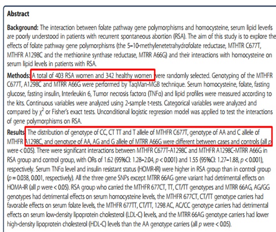 Nghiên cứu thực hiện trên 403 bệnh nhân sảy thai liên tiếp với 342 phụ nữ khỏe mạnh cho thấy đa hình gen MTHTR C677T, MTHFR A1298C and the methionine synthase reductase, MTRR A66G có liên quan chặt chẽ gây ảnh hưởng đến chu trình chuyển hóa acid folic, làm tăng tỷ lệ sảy thai liên tiếp. (2)