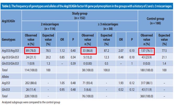 Nghiên cứu thực hiện trên 152 phụ nữ có tiền sử sảy thai liên tiếp (>=2 lần) so với nhóm chứng gồm 180 phụ nữ khỏe mạnh. Kết quả cho thấy: Đa hình Arg353/Gln353 có sự tăng nhẹ đối với nhóm bệnh: 78% và 86,8% so với nhóm chứng (76,1%). Từ đó cho thấy có mối liên quan giữa đa hình này đối với sảy thai liên tiếp. (3)