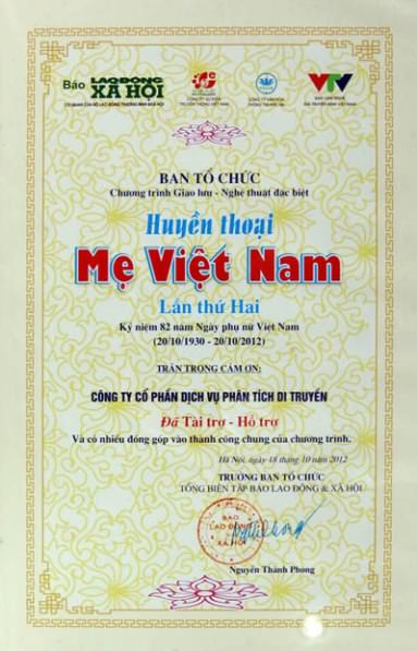 Với những đóng góp thiết thực cho sự thành công của chương trình Giao lưu nghệ thuật tri ân và tôn vinh các Mẹ Việt Nam anh hùng, Công ty Cổ phần dịch vụ phân tích di truyền đã được ban tổ chức trao tặng Bảng vàng…