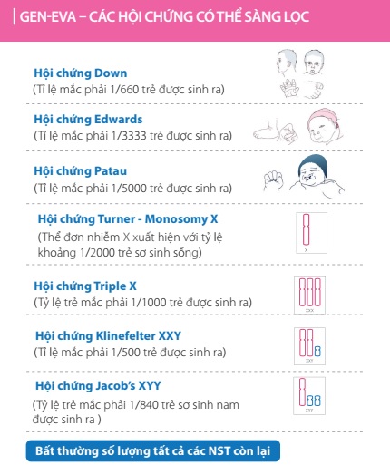 Như nhiều mẹ đã biết, xét nghiệm sàng lọc trước sinh từ tuần thai thứ 10 có thể biết về Patau, Edward, Down. Với GenEva – NIPT’S Illumina còn có thể cho các mẹ biết nhiều thông tin hơn nữa trong đó có việc xác định thai nhi có bị tam nhiễm ở tất cả 23 cặp nhiễm sắc thể.