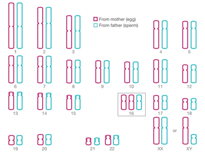 Trong hình là thể tam nhiễm sắc thể 16 – bất thường ở NST 16