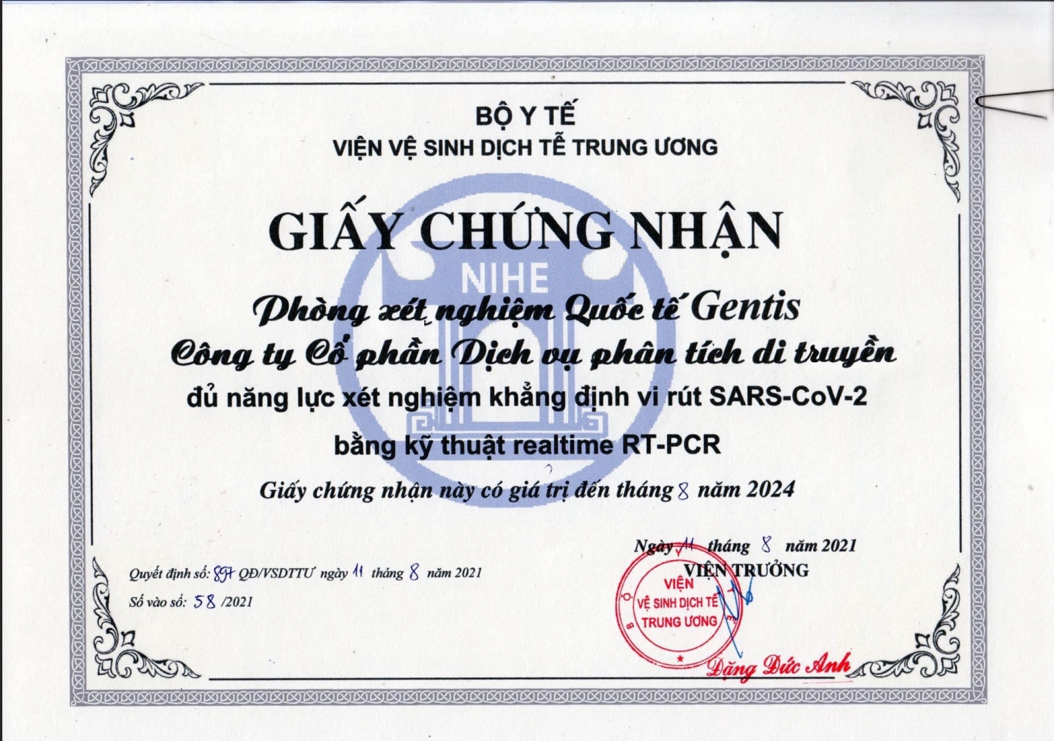 Công ty Cổ phần Dịch vụ Phân tích Di truyền (GENTIS) là đơn vị đã được cấp chứng nhận xét nghiệm virus SARS-CoV-2 từ tháng 08/2021 và nằm trong danh sách được Bộ Y tế cho phép thực hiện xét nghiệm khẳng định Covid-19 (theo thông tin tra cứu tại trang thông tin điện tử của Cục Y tế dự phòng - Bộ Y tế). Theo đó, GENTIS đã được cơ quan chức năng thẩm định, chứng nhận và cấp phép đầy đủ về hồ sơ pháp lý, cơ sở vật chất, trang thiết bị y tế, điều kiện nhân sự và tất cả quy trình kỹ thuật liên quan. Ngay sau khi được cấp chứng nhận, GENTIS đã chung tay cùng Sở Y tế Hà Nội trong nhiều chiến dịch xét nghiệm diện rộng và đã triển khai xét nghiệm cho hàng trăm nghìn mẫu bệnh phẩm tại Hà Nội.