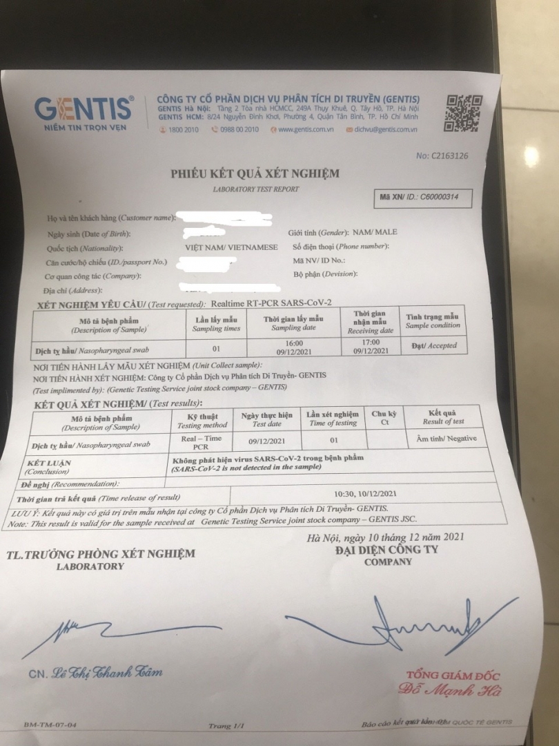 Phiếu kết quả xét nghiệm giả, sai mã QR code và không có thông tin khách hàng trên hệ thống phần mềm GENTIS
