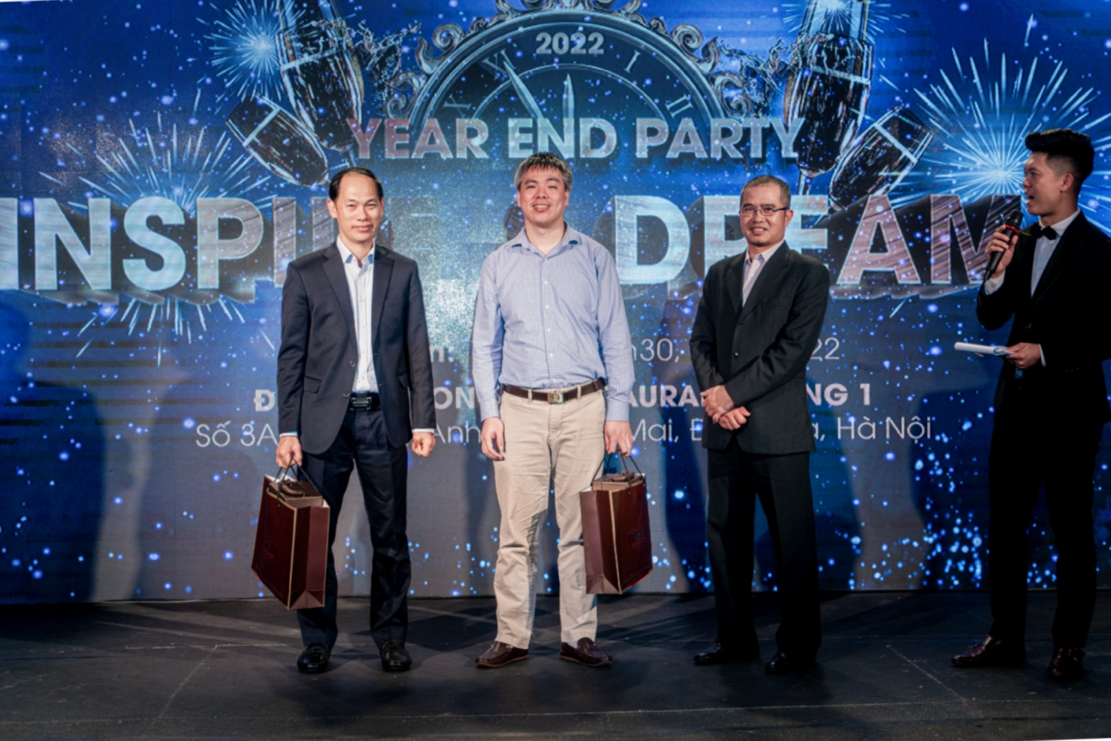 Ông Nguyễn Quang Đức - đại diện cho ông Cao Tiến Dũng (trái), Ông Trần Quốc Quân (giữa), Ông Hoàng Đức Hùng (Phải) chụp hình lưu niệm tại chương trình Year End Party GENTIS