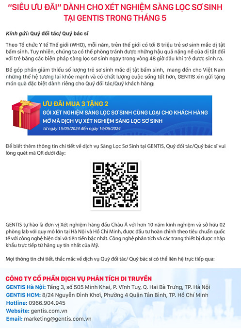 - Đối tượng áp dụng: Các khách hàng tại khu vực miền Bắc lần đầu tiên mở mã dịch vụ xét nghiệm SLSS tại GENTIS.
