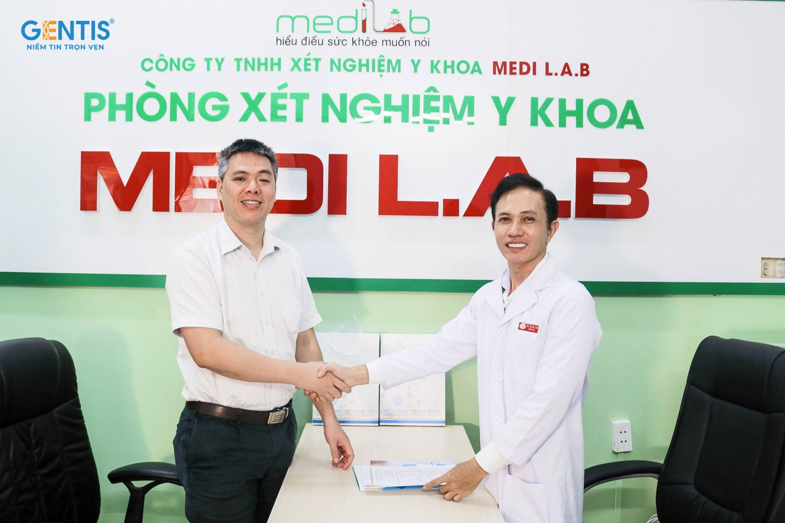 Tham dự ký kết có Ông Trần Quốc Quân - Giám Đốc GENTIS HCM, Ông Vũ Duy Tân - Giám Đốc Trung tâm xét nghiệm Y Khoa MEDILAB, đại diện lãnh đạo và chuyên viên các phòng ban.