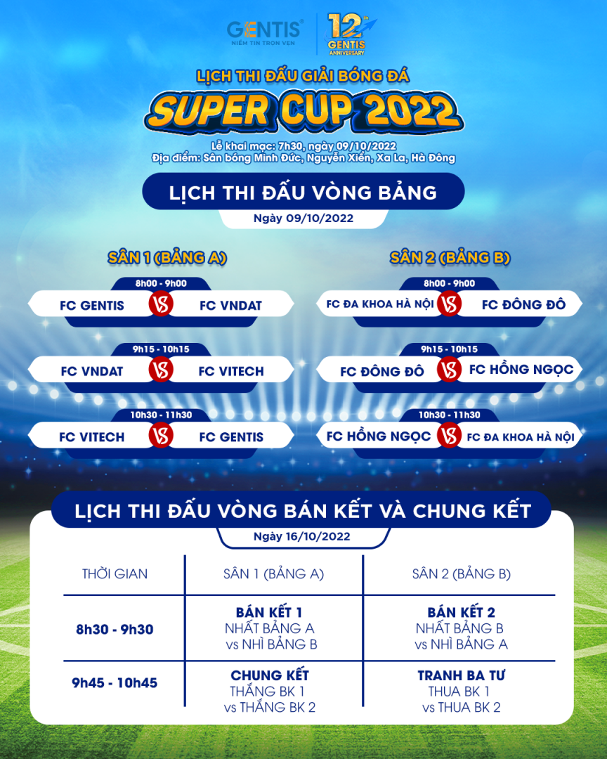 Chương trình khai mạc giải bóng đá Super Cup 2022 sẽ diễn ra vào lúc 7h30 ngày 09/10/2022. Sau đó sẽ là 6 trận đấu vòng bảng của cả 6 đội.