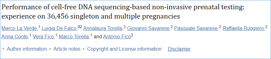 - La Verde, Marco et al. “Performance of cell-free DNA sequencing-based non-invasive prenatal testing: experience on 36,456 singleton and multiple pregnancies.” BMC medical genomicsvol. 14,1 93. 30 Mar. 2021, doi:10.1186/s12920-021-00941-y