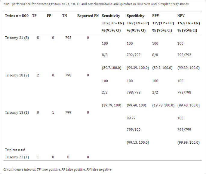 Kết luận:Nghiên cứu chứng minh được Độ nhạy và độ đặc hiệu của xét nghiệm NIPT cho đa thai tương tự như thực hiện NIPT trên thai đơn. Do đó có thể thực hiện NIPT cho các trường hợp đa thai trên 3 Hội chứng Trisomy 13,18,21.