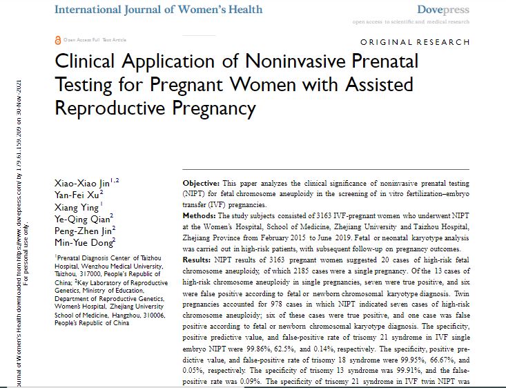 - Jin, Xiao-Xiao et al. “Clinical Application of Noninvasive Prenatal Testing for Pregnant Women with Assisted Reproductive Pregnancy.” International journal of women's health vol. 13 1167-1174. 30 Nov. 2021, doi:10.2147/IJWH.S337249