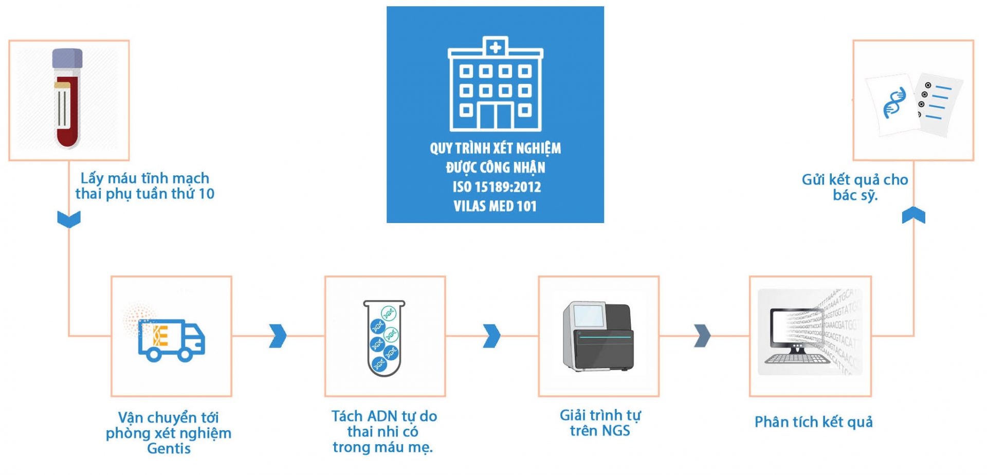- Mẫu sử dụng: 5mL máu mẹ ở thai tuần tuần thứ 9 – 32. Bảo quản mẫu: tối đa 5 ngày ở 4 độ C