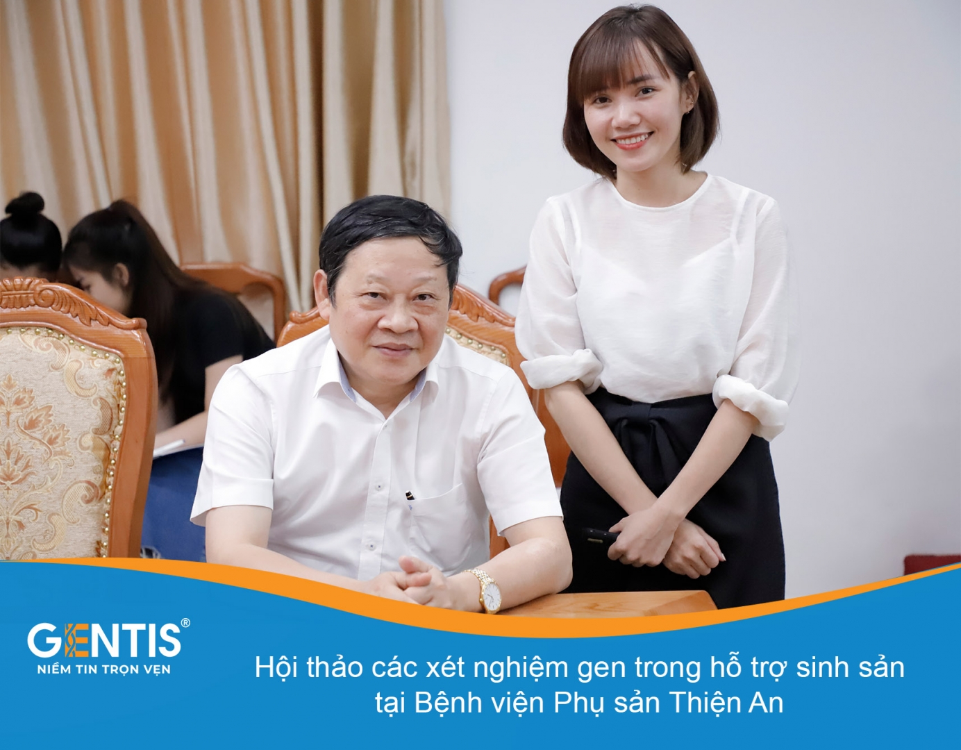 GS.TS Nguyễn Viết Tiến Nguyên Thứ trưởng Bộ Y tế, Giám đốc Trung tâm HTSS BV PS Thiện An chụp ảnh cùng ThS. Đào Hải Yến (GENTIS)