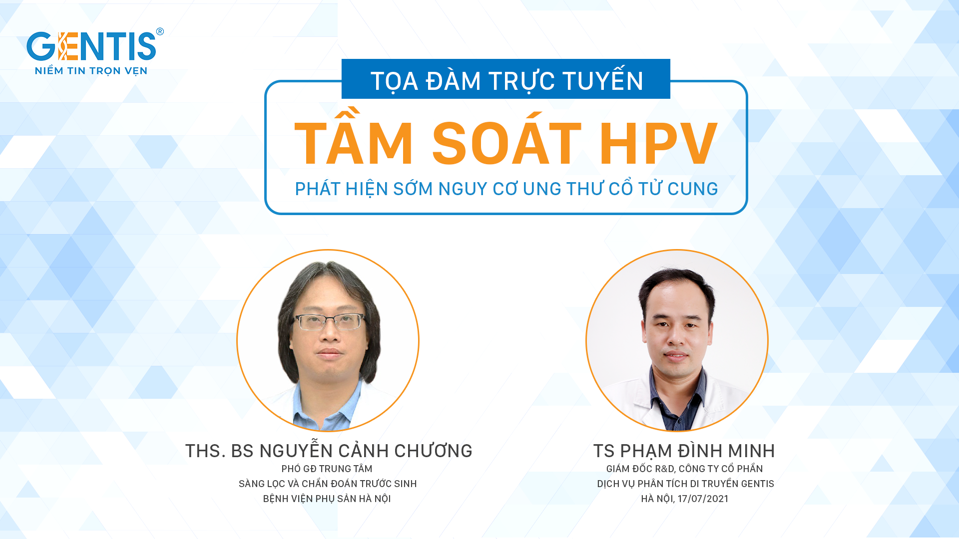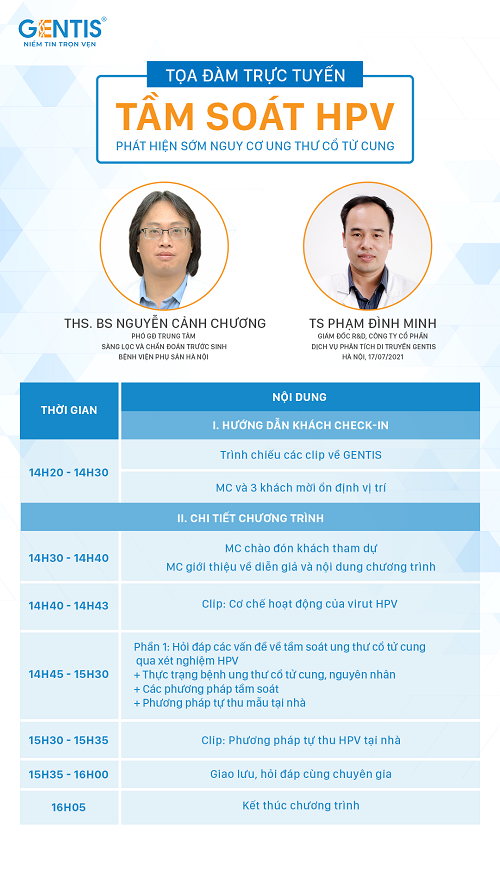 Theo dõi ngay Hội thảo “TẦM SOÁT HPV - Phát hiện sớm nguy cơ ung thư cổ tử cung" vào lúc 14h30 ngày 17/07/2021 trên fanpage: facebook.com/gentis.official.