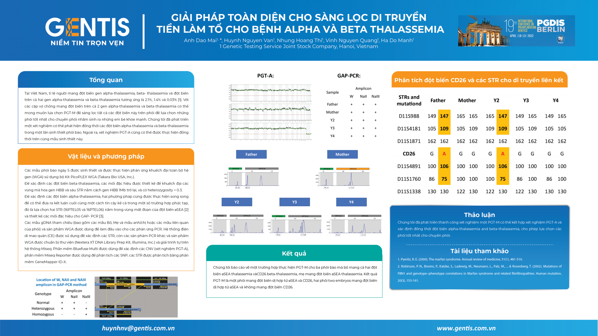 Với bài báo cáo thứ hai, GENTIS đã đưa ra quy trình thực hiện PGT-A kết hợp với PGT-M cho trường hợp một cặp vợ chồng mang đồng thời hai đột biến gen bệnh alpha-thalassemia và beta-thalassemia. Quy trình xét nghiệm này sử dụng đồng thời các kỹ thuật GAP-PCR, giải trình tự vùng chứa đột biến và phân tích di truyền liên kết dựa vào các STR (short tandem repeat) để xác định các phôi có mang đột biến alpha và beta thalassemia hay không. Điều này cũng giúp việc phân tích và đưa ra kết luận cuối cùng một cách tin cậy kể cả trong một số trường hợp phức tạp. Cả 3 mẫu phôi bào của ca này đều được xác định là chỉnh bội nhờ xét nghiệm PGT-A, trong đó một phôi mang cả hai đột biến dị hợp tử αSEA và CD26, hai phôi chỉ mang đột biến dị hợp tử αSEA và không mang đột biến CD26. Việc thực hiện PGT-A kết hợp xét nghiệm PGT-M và xác định đồng thời đột biến alpha-thalassemia lẫn beta-thalassemia, cho phép bệnh nhân và các bác sĩ lựa chọn các phôi tốt nhất cho chuyển phôi.