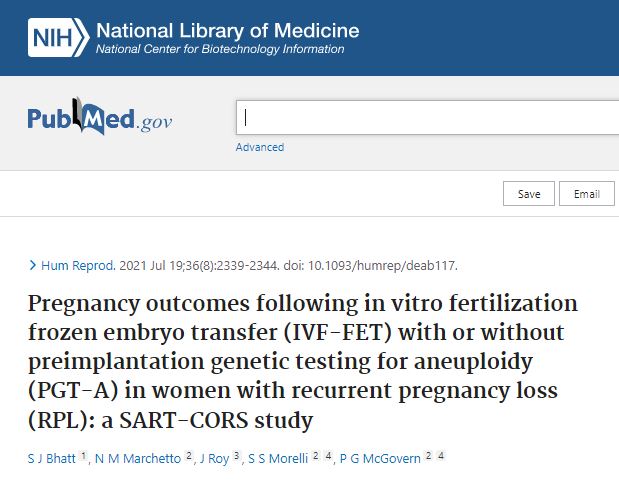 - Bhatt, S. J., et al. Pregnancy outcomes following in vitro fertilization frozen embryo transfer (IVF-FET) with or without preimplantation genetic testing for aneuploidy (PGT-A) in women with recurrent pregnancy loss (RPL): a SART-CORS study. Human Reproduction 2021; 36. (8): 2339-2344.