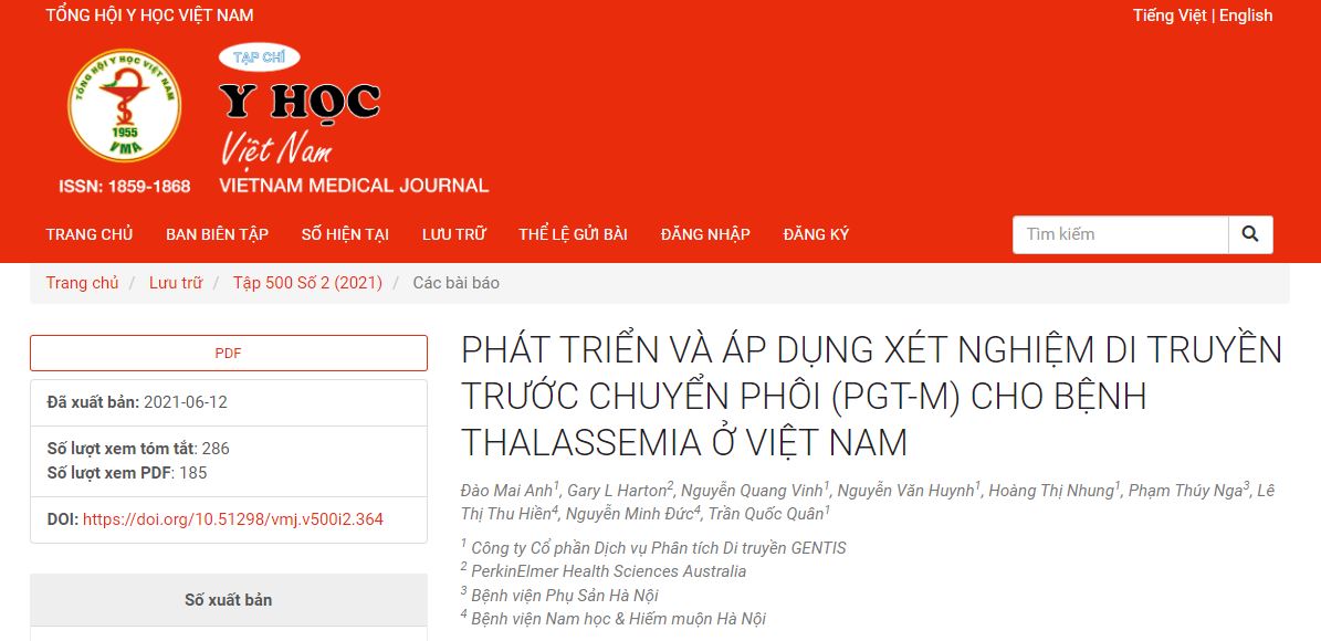 - Anh, Đ. M., Harton, G. L., Vinh, N. Q., Huynh, N. V., Nhung, H. T., Nga, P. T., ... & Quân, T. Q. (2021). PHÁT TRIỂN VÀ ÁP DỤNG XÉT NGHIỆM DI TRUYỀN TRƯỚC CHUYỂN PHÔI (PGT-M) CHO BỆNH THALASSEMIA Ở VIỆT NAM. Tạp chí Y học Việt Nam, 500(2).