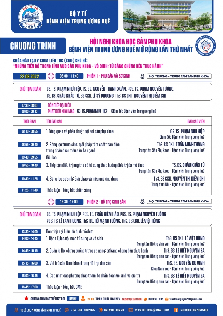 - Địa điểm: Hội trường Trung tâm Sản Phụ khoa, BVTW Huế