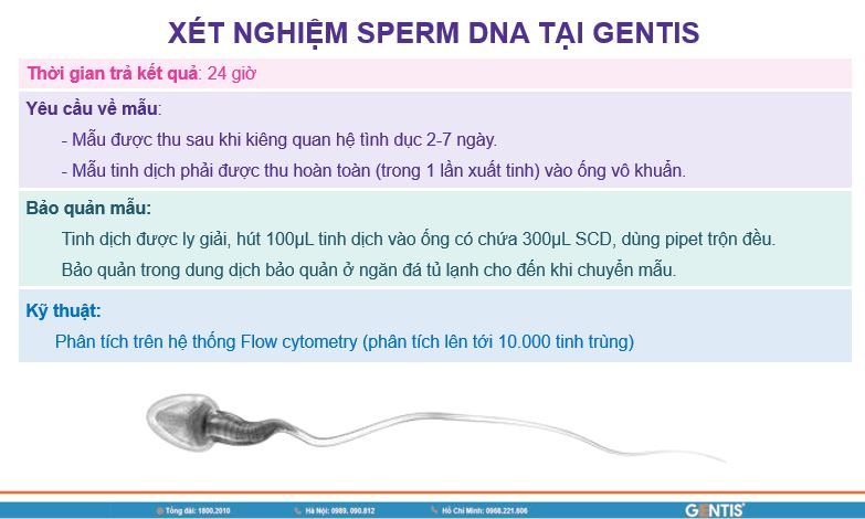 Sperm DNA là xét nghiệm định lượng tỉ lệ DNA tinh trùng bị đứt gãy dựa vào sự đổi màu của thuốc nhuộm thông qua hệ thống đếm tế bào dòng chảy - Flow cytometry. Xét nghiệm Sperm DNA có thể phân tích lên tới 10.000 tinh trùng với chi phí tối ưu, giúp mọi nam giới đều dễ dàng tiếp cận được. Đây là xét nghiệm cực kì cần thiết, giúp bác sĩ có thể tiên lượng được khả năng sinh sản của nam giới và đưa ra hướng can thiệp phù hợp nhất (lựa chọn phương pháp hỗ trợ sinh sản).