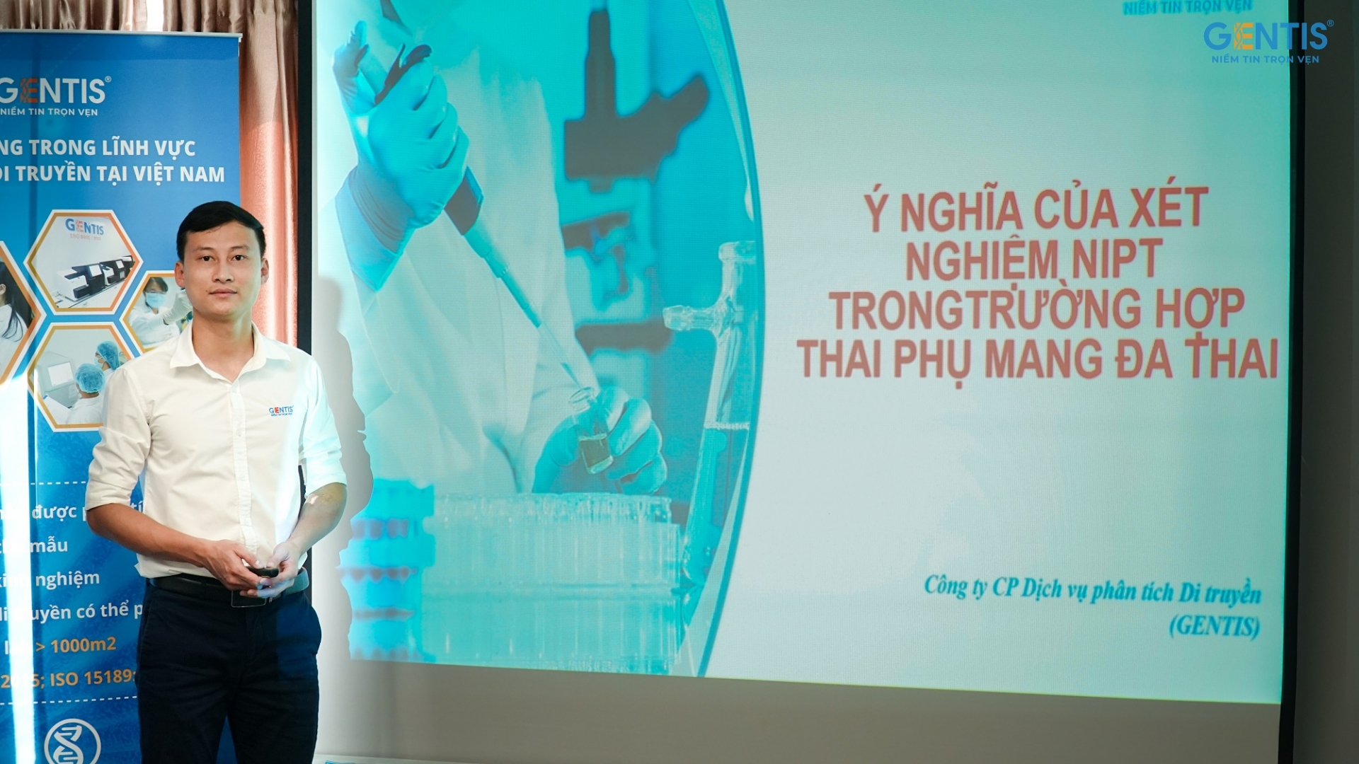 Mở đầu tọa đàm, Ths. Nguyễn Văn Huynh đã chia sẻ chi tiết về xét nghiệm Sàng lọc dị tật bẩm sinh NIPT cho đối tượng đa thai (NIPT đa thai) đã và đang được GENTIS triển khai và đẩy mạnh hiện nay. Xét nghiệm NIPT là xét nghiệm quan trọng và cần thiết cho các mẹ bầu. Trong trường hợp mẹ bầu mang thai đôi, thai ba, sàng lọc dị tật bẩm sinh NIPT đa thai vẫn thực hiện được và được nhiều Hiệp hội trên thế giới khuyến cáo thực hiện.
