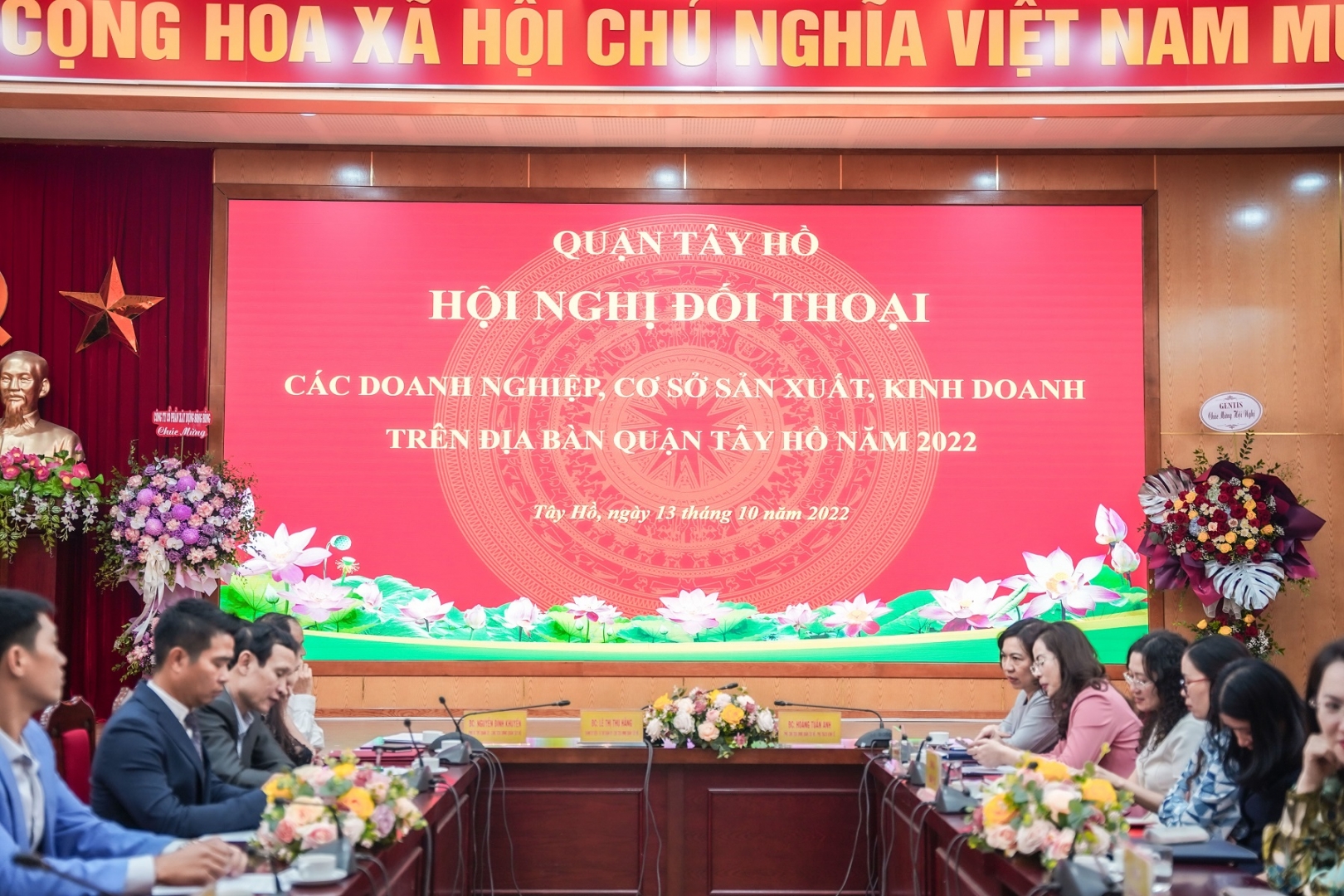 Hội nghị Đối thoại có sự góp mặt của hơn 50 đại biểu các cấp lãnh đạo tại Sở ban ngành Thành phố, Quận ủy, Phường, Chi cục Quận Tây Hồ và gần 70 đại diện của các Doanh nghiệp trên địa bàn Quận.