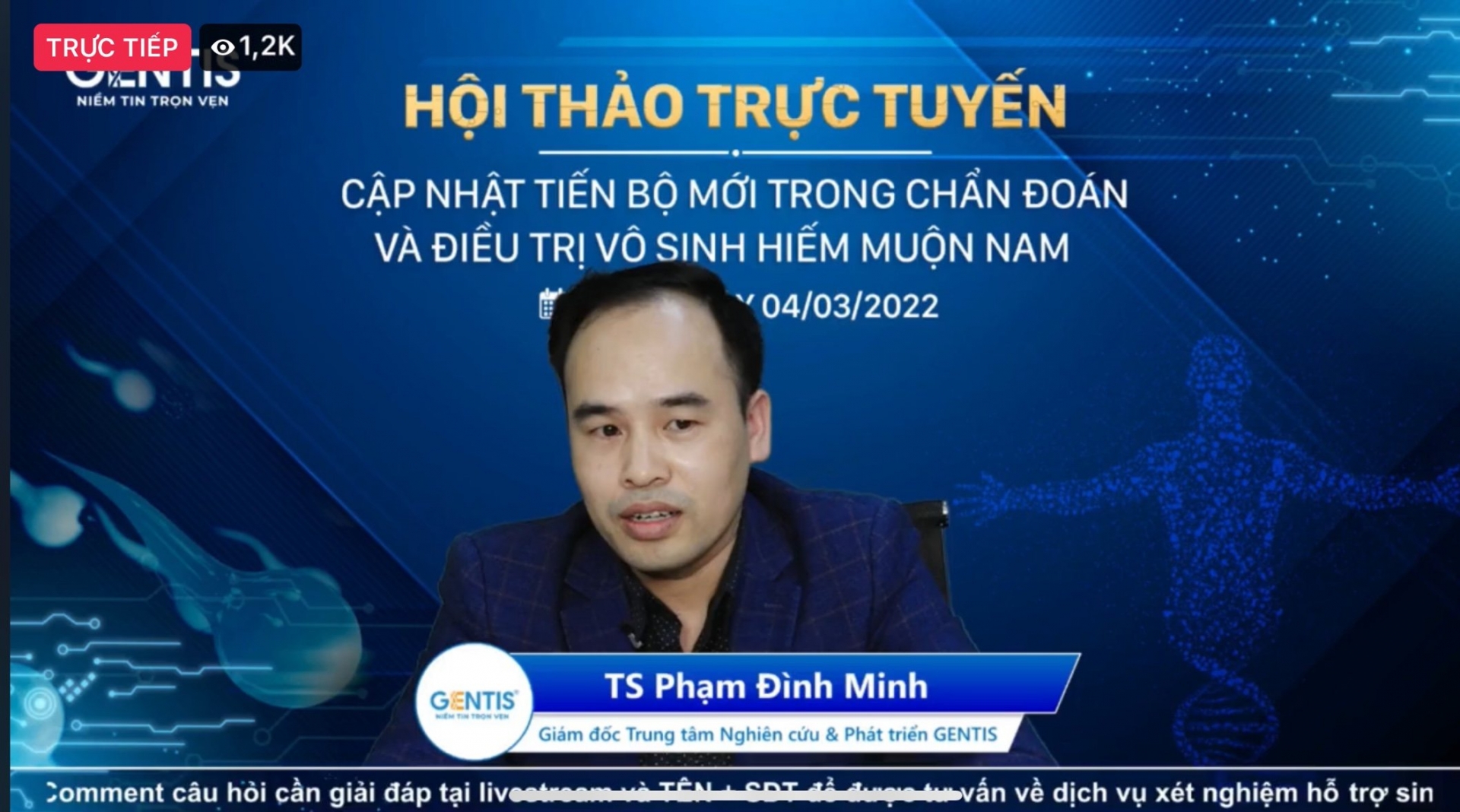 Nhấn mạnh ý nghĩa của các xét nghiệm nam khoa hỗ trợ cho việc sàng lọc và chẩn đoán vô sinh nam, Giám đốc Trung tâm Nghiên cứu và Phát triển GENTIS giới thiệu các xét nghiệm kỹ thuật cao mới như: xét nghiệm bệnh lây qua đường tình dục STD, Phân mảnh ADN tinh trùng SCSA, xét nghiệm bất thường nhiễm sắc thể tinh trùng (Gen-SAT), xét nghiệm tinh dịch đồ mở rộng, phân tích gene/di truyền chuyên sâu (WES dành cho nam giới)...